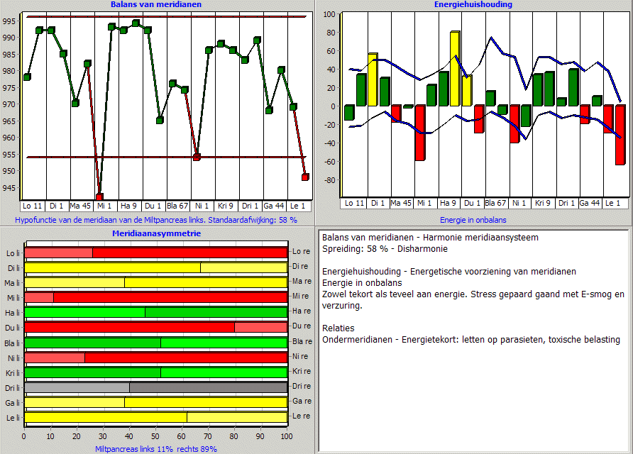 Testen van de energiehuishouding alle meridianen en van enkelpuntsmeting, kwantitative energieverhouding, kwalitatieve energiehuishouding en de regulatie bij voor en na-metingen.