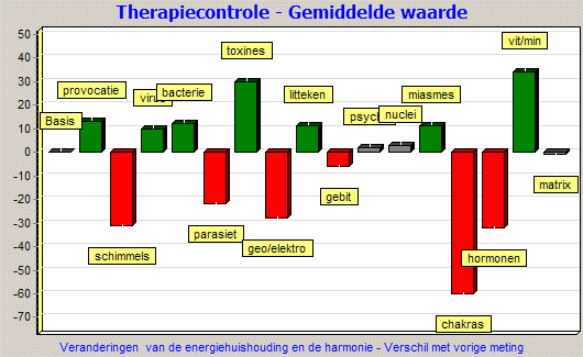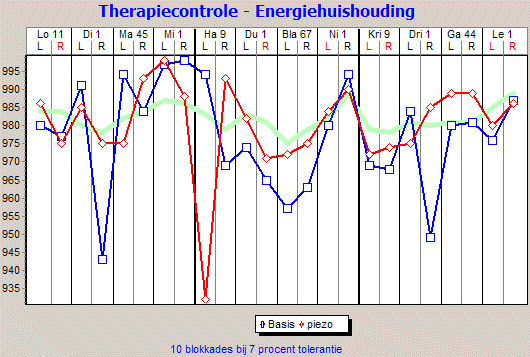 In de loop van de behandelingen kunnen alle grafieken over elkaar heen worden geprojecteerd. Met behulp van de therapiecontrole van Prognos hebt u dan een permanente bewaking van het verloop van de genezing. Dit houdt in dat u met Prognos beschikt over een kwaliteitscontrole van de therapie.